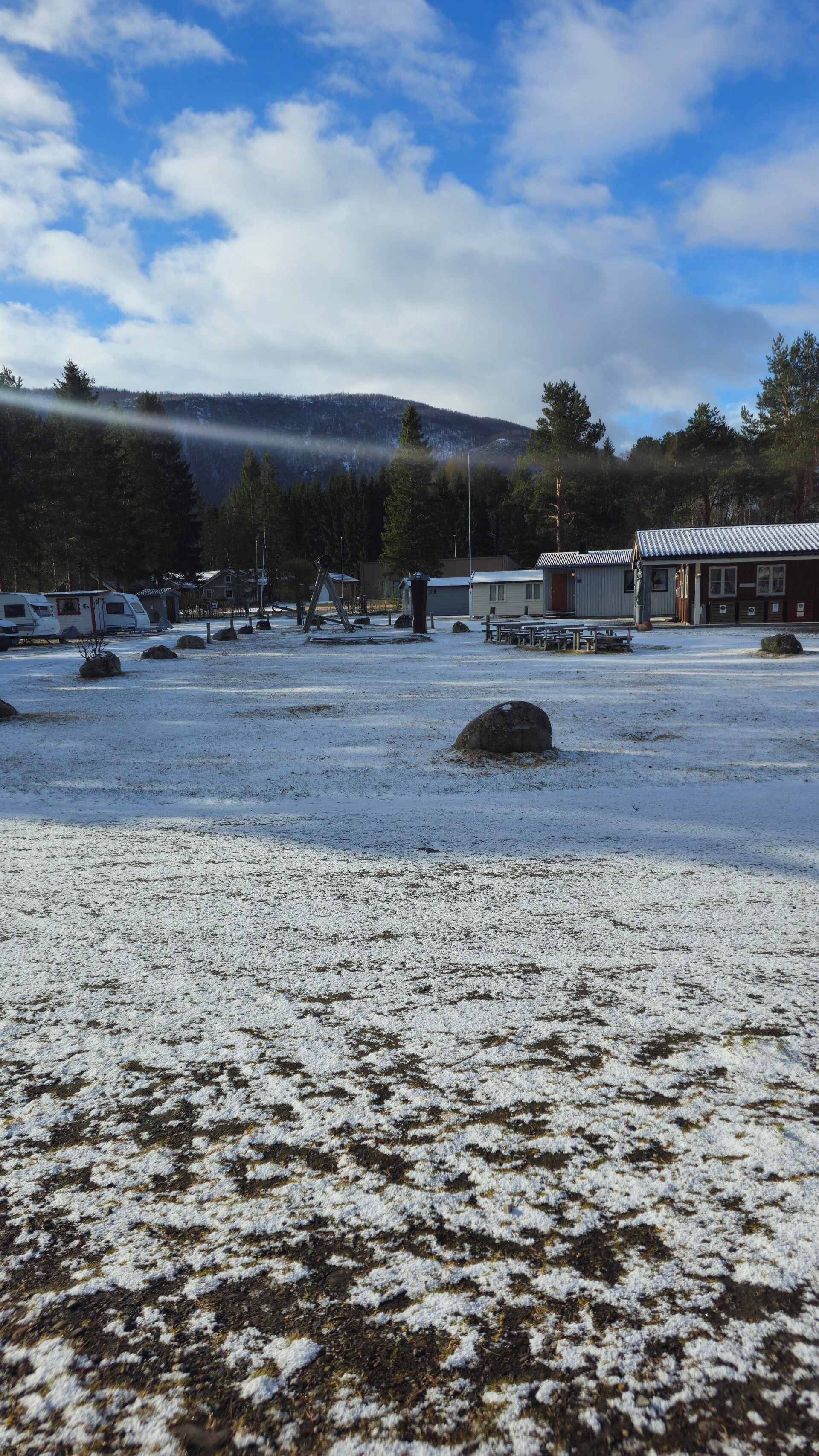 Une fois le ferry passé, nous continuons notre route en direction de Ballangen et arrivé au camping, une grosse giboulée de neige recouvre le terrain de blanc.